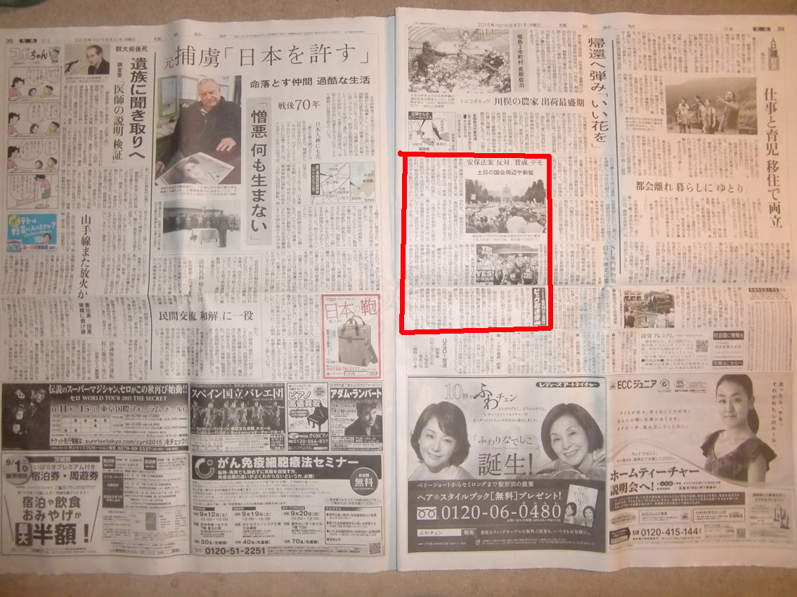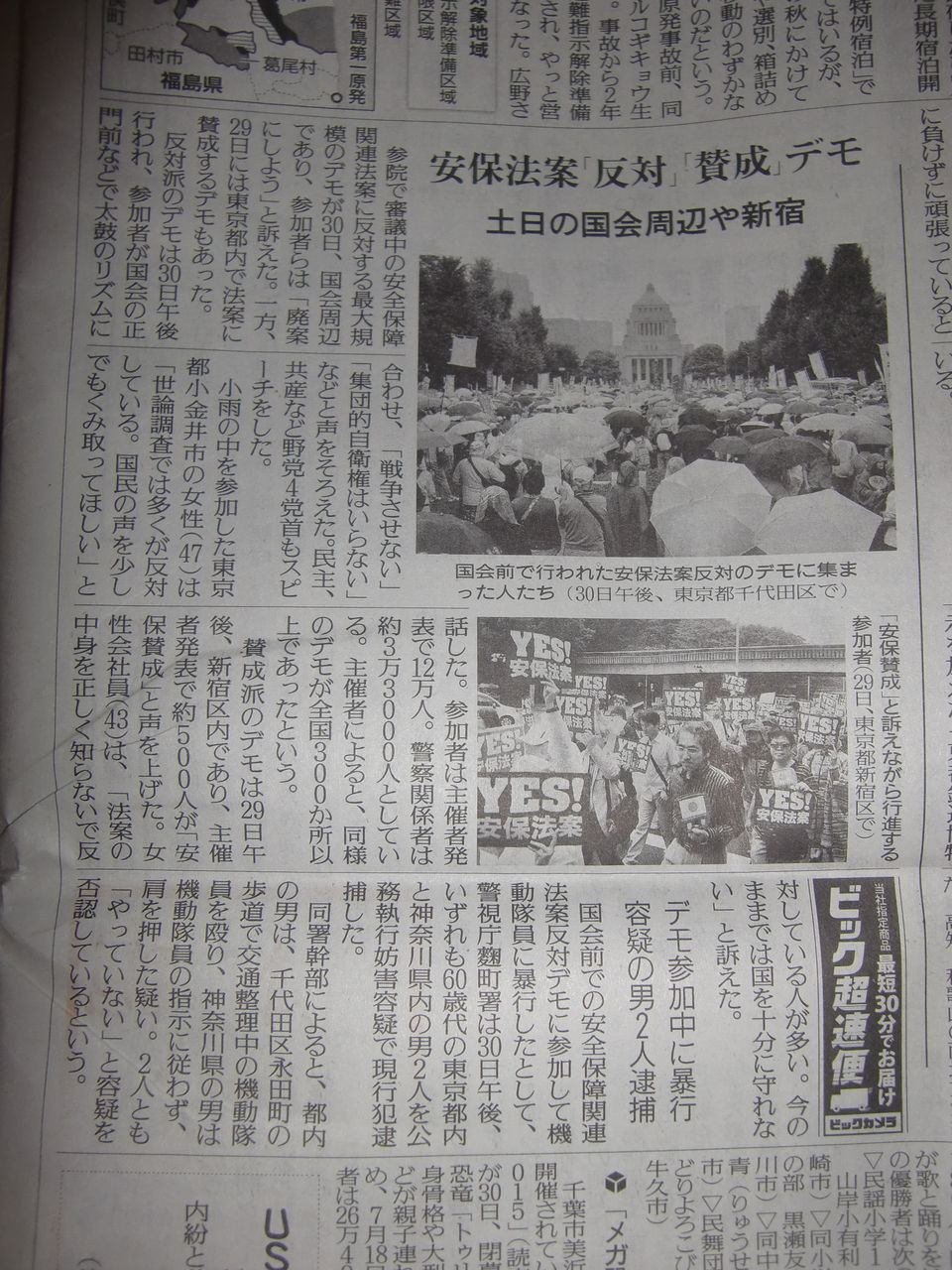 8月30日、全国300か所で大規模な安保反対デモがあり、国会前には主催者発表で12万人が集まり(※この主催者発表についてはこちらの記事参照)国会前の通りを埋め尽くした次の日の一面です。
