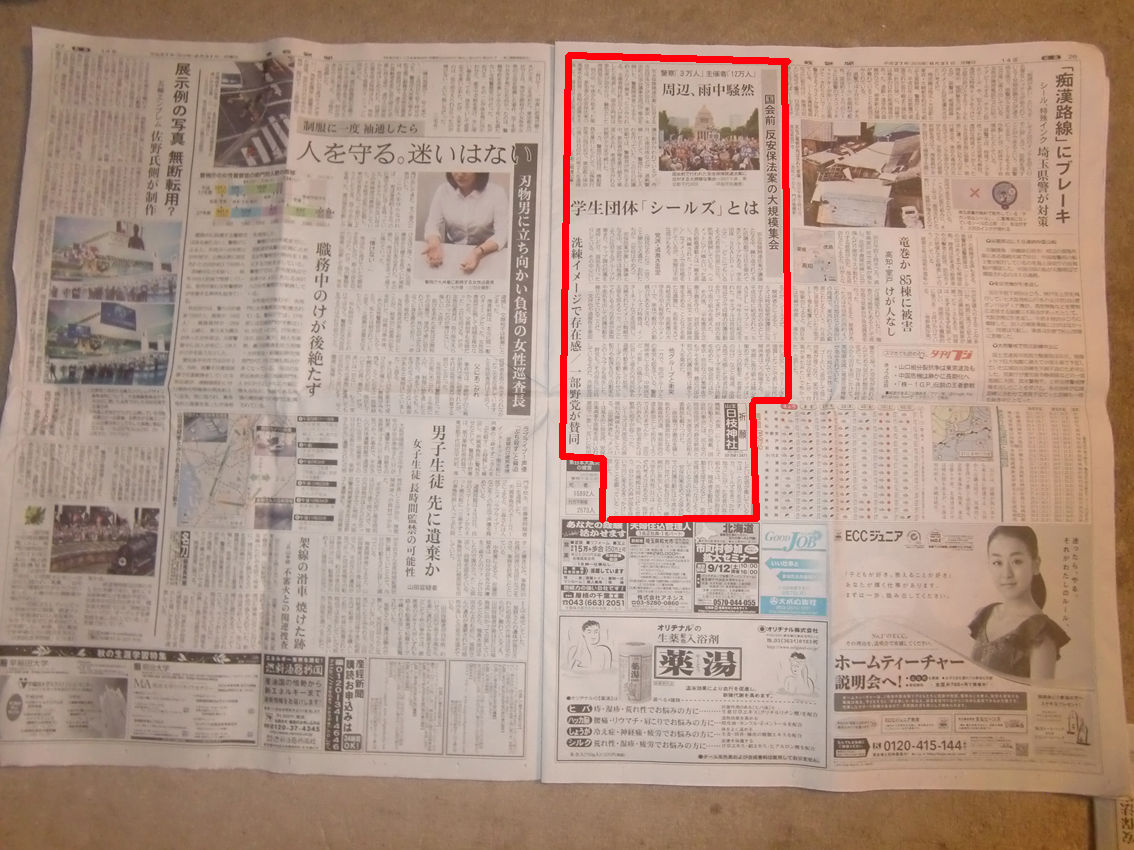 産経新聞は学生グループSEALDsを特集。しかし、「洗練された『クリーン』なイメージで存在感を示しているが、実態は不明な部分もある」などと、彼らの裏に何らかの組織があったり、暴力性を隠しているのではないか、との印象を植え付けるような表現をしています。