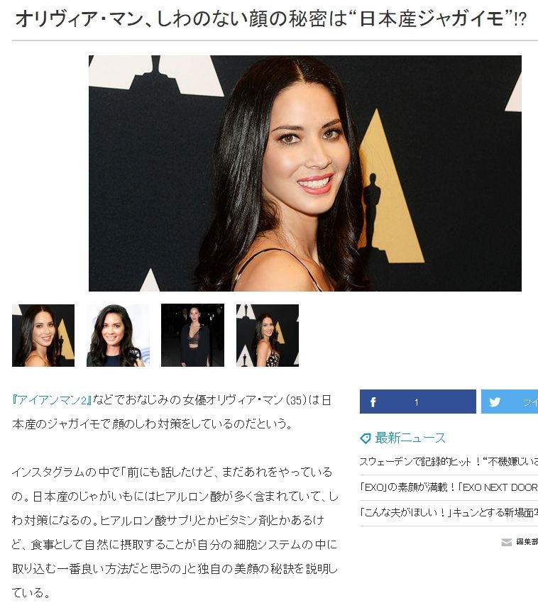 オリヴィア・マン しわのない顔の秘密は日本産ジャガイモ?
