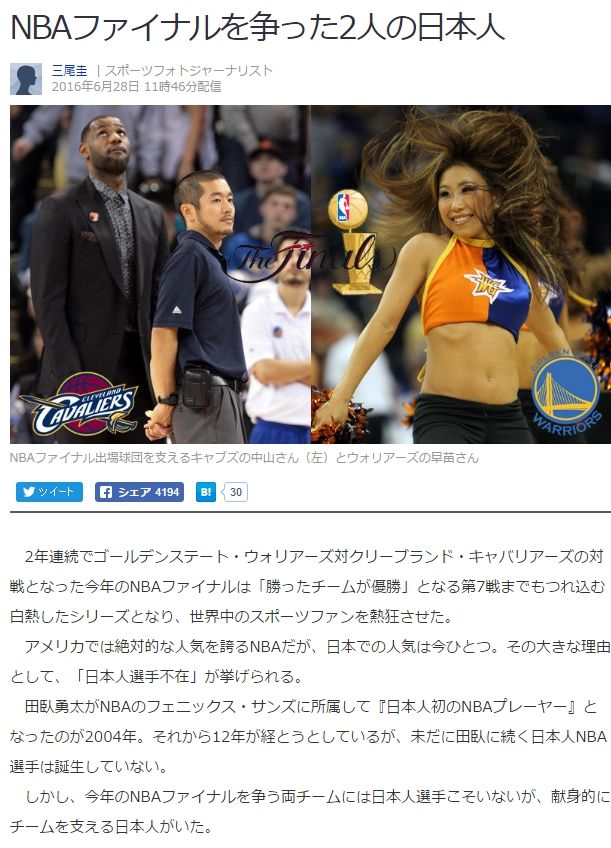 (ウォリアーズ球団幹部の日本人妻と、キャバリアーズのアシスタント・トレーナーの話。2016年6月28日Yahoo!ニュース)