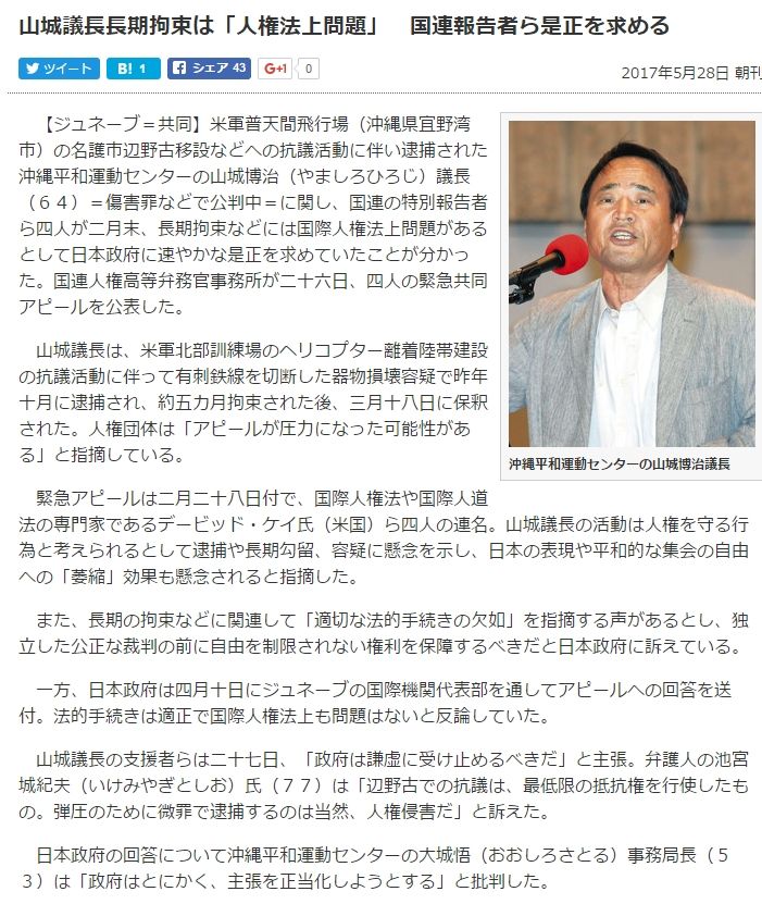 今でさえ、辺野古移設反対活動を行っていた山城博治氏が逮捕・拘束され、長期の拘束に対し、国連人権委員会特別報告者4人が「人権上問題がある」として、政府に是正を求めています。