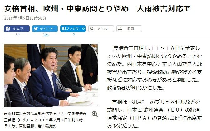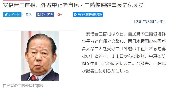 - 今回の水害に関し、共産党の志位和夫が、11日から予定されていた安倍総理の欧州・中東歴訪を中止すべきだと主張。
