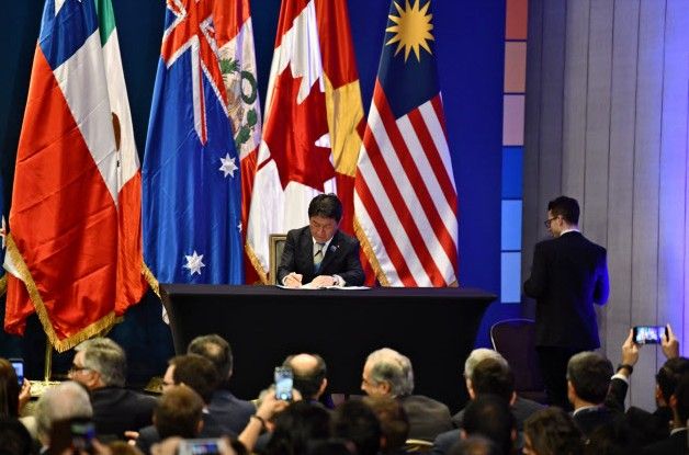 (↑TPP11に署名する茂木経済再生担当相。日経新聞より)