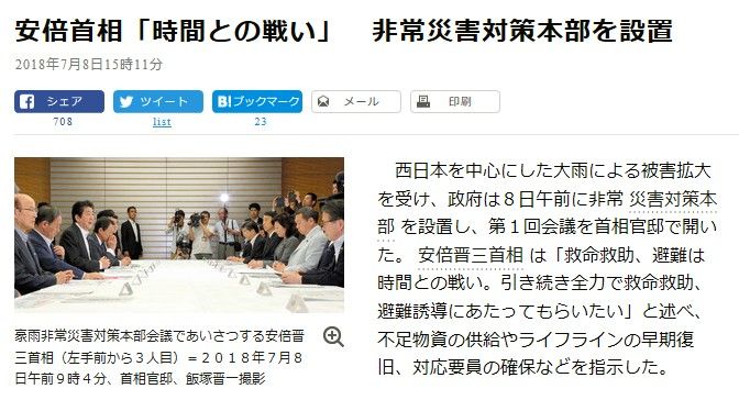 さて、7月5日午後の段階で、気象庁は西日本に記録的大雨が降ることを予報しておりました。そして、7日にはすでに大災害になっていたにもかかわらず、総理大臣である安倍晋三は午前中に会議を開いただけで帰宅し、午後はずっと自宅で過ごしました。