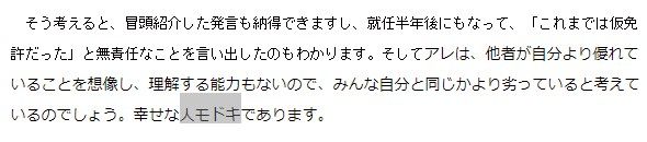 多分、石平太郎や、それに賛意を示している連中は、「総理大臣は偉い人だ! えらい人を『君』で呼ぶなんて傲慢だ!」と言いたいんでしょうが、そんな考えを押し付けて「人間としての基本が何もできていない」とか言うほうがよっぽど傲慢ですわ。産経新聞の編集長の乾正人という男も、「首相を呼び捨てするのはヘイトスピーチ」とかいう意味不明な妄言を吐いていましたが、「総理大臣は一般国民の上司」とか勘違いしているんでしょうね。