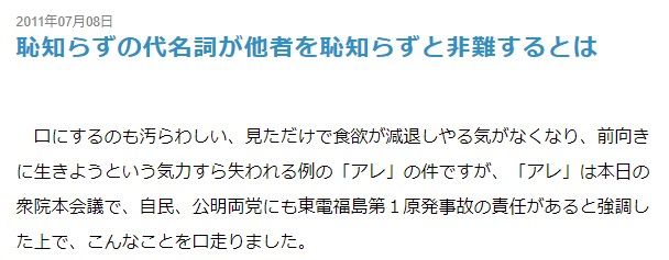 - 阿比留瑠比は鳩山首相(当時)を「アレ」「人モドキ」と呼んでいるが、それは批判しない石平太郎。
