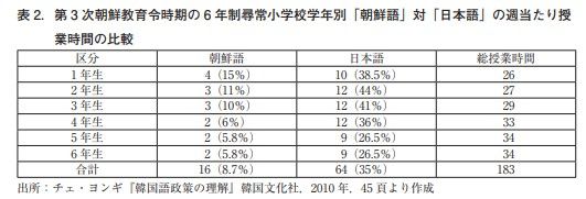 小学校における授業時間数は以下のようになっています。朝鮮語の授業は少しずつ減らされ、最後にはゼロになってしまいます。