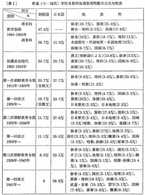 - 併合後の小学校では授業の約9割の授業は日本語で行われた。最終的に朝鮮語の授業は全て廃止された。