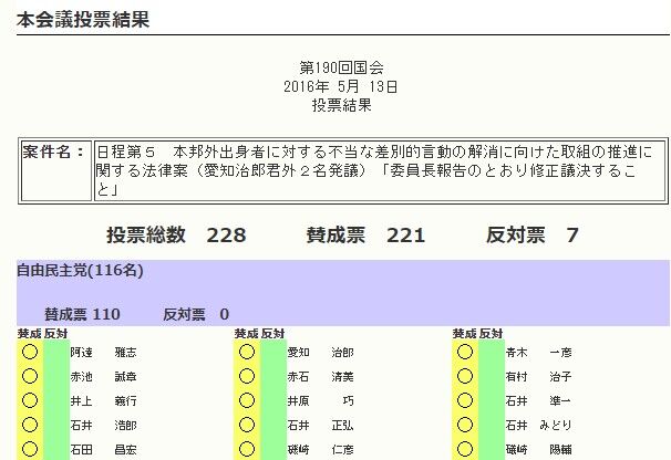(ちなみに、反対票を投じた中には、ネトウヨ党である「日本のこころを大切にする党」の和田政宗や中山恭子のほかに、山本太郎や福島瑞穂も又市征治もいるが、彼らは対象が適法居住者に限定されていることを問題視して反対票を投じているので、和田政宗や中山恭子とは反対理由が真逆である。(福島瑞穂HPと山本太郎HP参照))