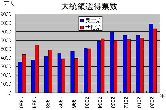 今回、バイデンはトランプの1.08倍の票しかとっておらず、どちらかというとむしろ僅差の勝負になりました。コロナやトランプというこれまでにない特殊事情により、投票数自体が大幅に上がったために7900万票という得票になったのであり、何ら驚くところはありません。