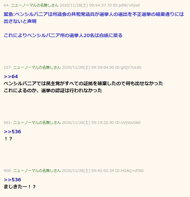 こんなバカげた提案をする議員がいるというだけでも驚愕ではありますが、ペンシルベニア州で選挙が白紙になったとか、議会が選挙人を選ぶことが決定したとか、そんな事実は微塵もありません。