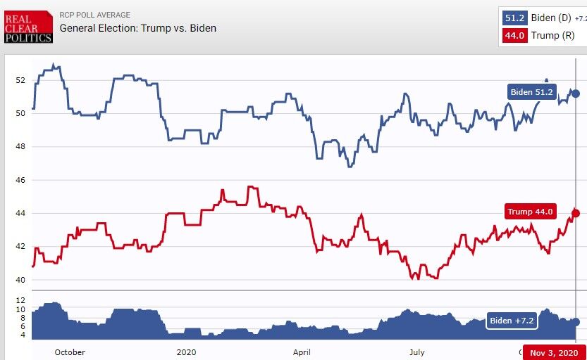 そもそも、大統領選前の世論調査でもバイデンはトランプをリードしていました。リアル・クリア・ポリティクスでは、バイデン51.2、トランプ44.0となっていました。