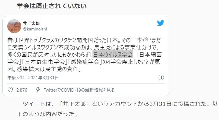 毎日新聞はこのツイートについて、「井上太郎」氏のブログやオンラインサロンの案内を掲載しているホームページにメールで問い合わせた。すると「サイトの事務局」と名乗る人物から返信があり、「(井上氏に)電話で聞いたところ、複数のサイトを見てツイートしたと申しておりました。もし正確でないなら、調べて正確なことに訂正するとのことでした」と回答した。井上太郎は「複数のサイトを見てツイートした」と言っていること。いったいどんなサイトを見たのか知りませんが、どこぞのバカサイトの妄想記事を見て脳みそ停止してツイートしたのでしょう。日本ウイルス学会などのHPの検索さえしないくせに。