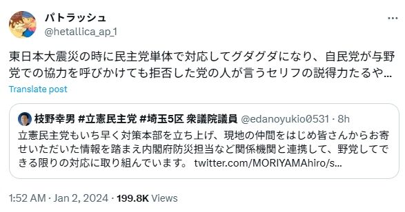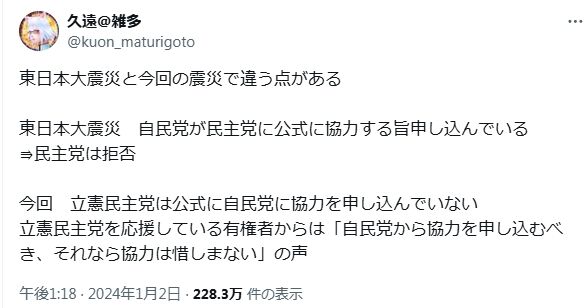 >>自民党が与野党での協力を呼びかけても拒否した党東日本大震災の時に民主党単体で対応してグダグダになり、自民党が与野党での協力を呼びかけても拒否した党の人が言うセリフの説得力たるや... https://t.co/Sj1gwvbdO4