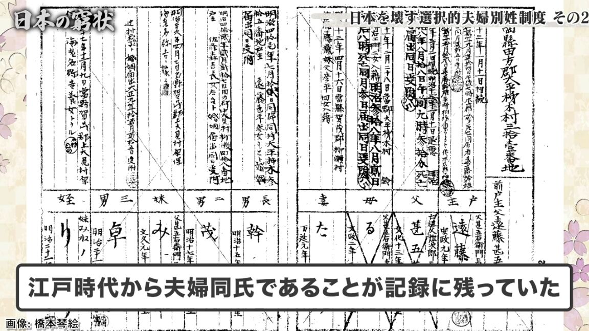 「夫婦別姓を押したい人たちがいるということわかるんですけれども、まずその帰化人には祖先に当たる明治初期の戸籍がないんですね。嘘をついてもバレないと勘違いしてるふしがあるかと思います。