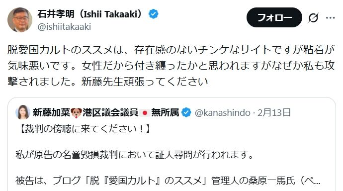 新藤加菜も、石井孝明も、自分がそうだからその程度の発想しかないんですよね。自分が相手の人種、性別、年齢などを攻撃理由にするような連中だから、相手もそうなんだと思う。だから「若い女性だから付き纏った」なんて妄想が生まれるわけです。私はこのブログを10年以上やっていますけど、批判対象の性別、年齢、人種、容姿に批判したことなど一度だってないんですけどね。