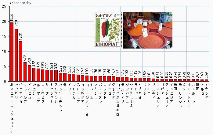 一次ソースを確認できなかったのですが、このグラフが正しいなら、韓国人がカプサイシンを他国に比べて過剰摂取しているなんてことはないでしょう。仮にこのグラフが間違っているとしても、韓国人が他国に比べて唐辛子を過剰に摂取しているという根拠は見つけられませんでした。ましてや、それによって脳が損傷しているとか火病を起こすとかあるわけがない。