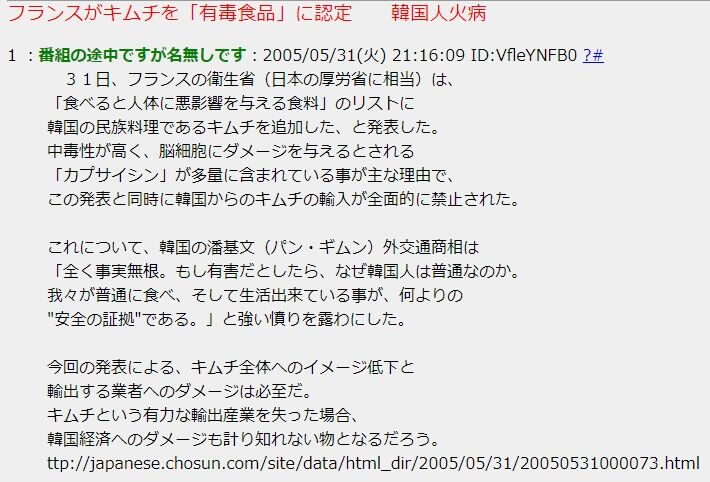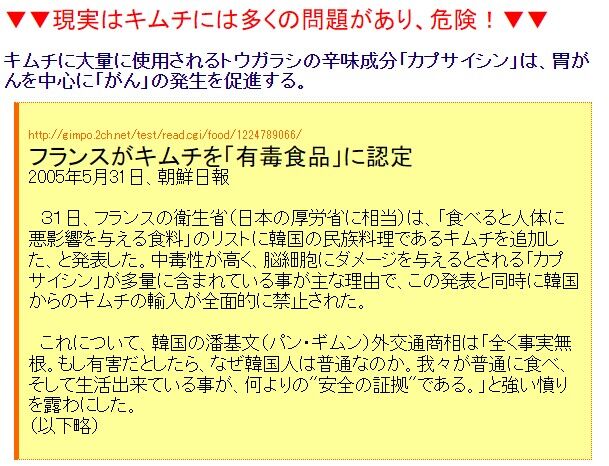 >>「フランスが韓国産キムチの輸入禁止したのが理由が韓国産キムチにカプサイシンが多すぎる事で脳にダメージを与える恐れがある(+発がん性)とかです」