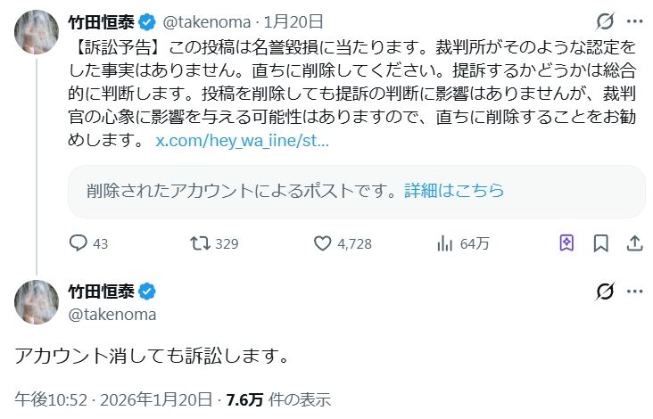 ↓また訴訟を持ち出して批判言論を抑え込もうとする竹田恒泰。7年前の裁判での敗訴で懲りていなかったようである。