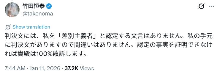 もしも竹田が本当に裁判所から差別主義者と認定されてことが無くて、これが名誉毀損に当たるのなら、竹田の行動もわかりますよ。でも、竹田はこんな風に言える立場にあるのでしょうか? 詳細を見ていきましょう。