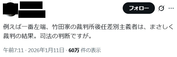 結論から言うと、竹田は「裁判所認定差別主義者」と呼ばれても仕方がない立場におり、訴訟によってそのような批判を黙らせようとするのは、訴訟の権利を濫用した批判の封じ込めであり、言論の自由を委縮させる反民主主義的な行いと糾弾せざるを得ません。