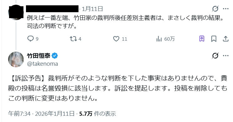 - 竹田恒泰、「裁判所認定差別主義者」との批判に、「裁判所がそのような認定をした事はない」と主張し、名誉毀損訴訟をすると脅し、批判を封じる。