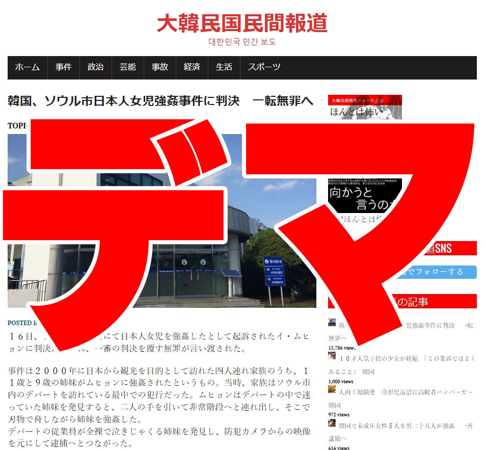 - 『大韓民国民間報道』というサイトに掲載されていたニュースは全てフェイク。作成者が金を稼ぐために作ったデマサイトだと認めた。