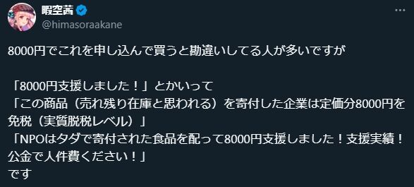 - 商品購入額と送料の8000円はクラウドファンディングによって集められているのに、暇空はそれを把握せず、企業が売れ残り在庫を寄付して定価分8000円を免税する脱税を行っているとデマ妄想。