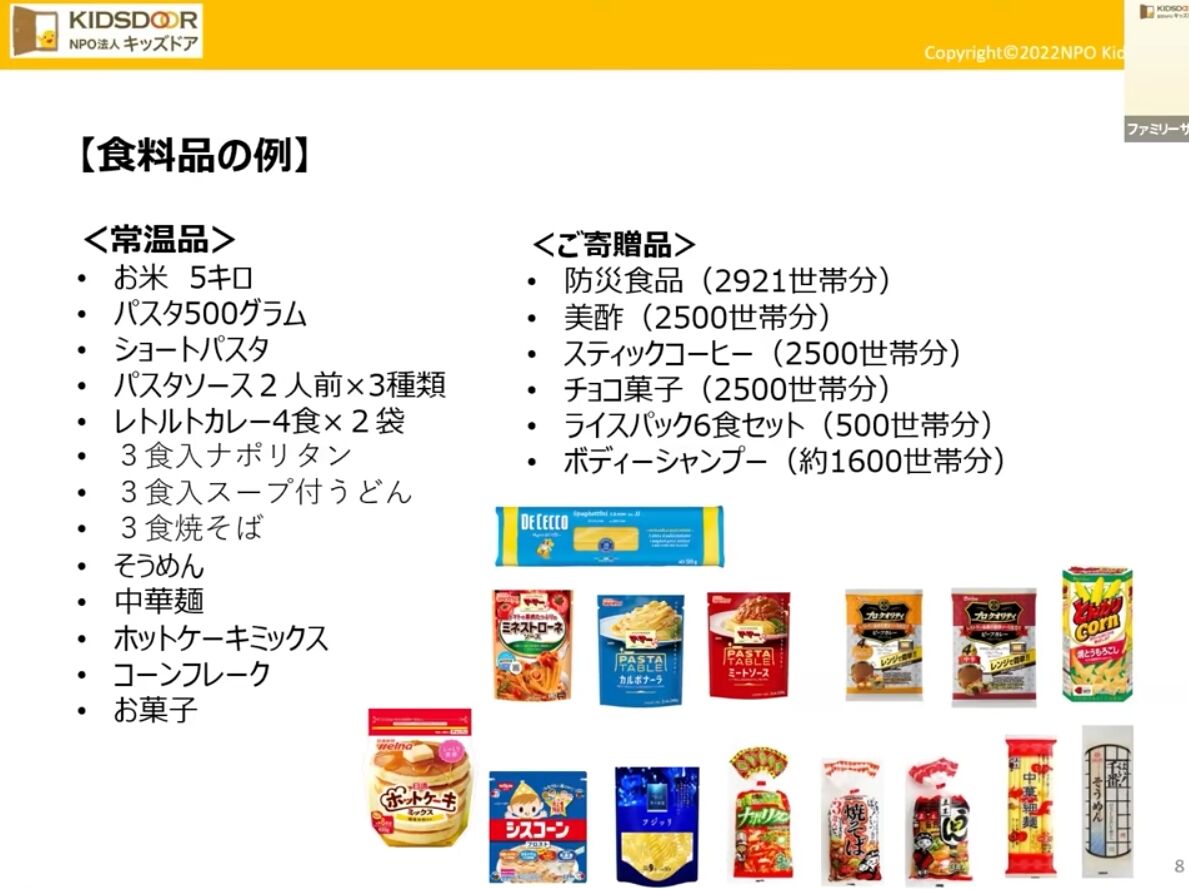 上記YouTubeで説明されていますが、このリストの「常温品」はクラウドファンディングから支出され、「ご寄贈品」が企業から寄贈されています。
